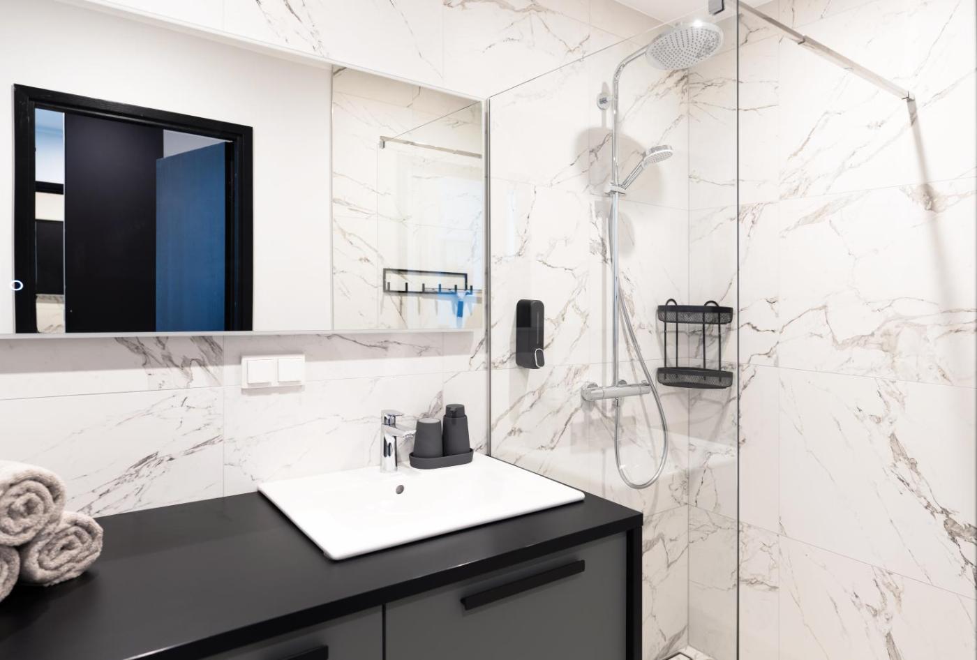 One-Bedroom Apartment. This air-conditioned apartment includes 1 living room, 1 separate bedroom and 1 bathroom with a shower. In the well-equipped kitchen, guests will find a refrigerator, a dishwasher, kitchenware and a toaster. Boasting a balcony with city views, this apartment also offers a washing machine and a flat-screen TV with cable channels. The unit has 2 beds.