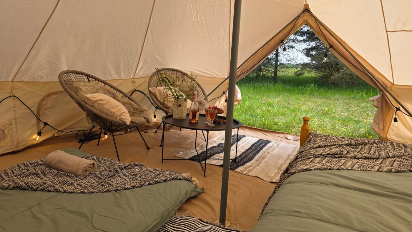 Tent. Guests will find a stovetop, a refrigerator, kitchenware and an oven in the kitchen. The tent also comes with a barbecue. This tent has a shared bathroom, a dining area, an electric kettle as well as a patio. The unit has 1 bed.