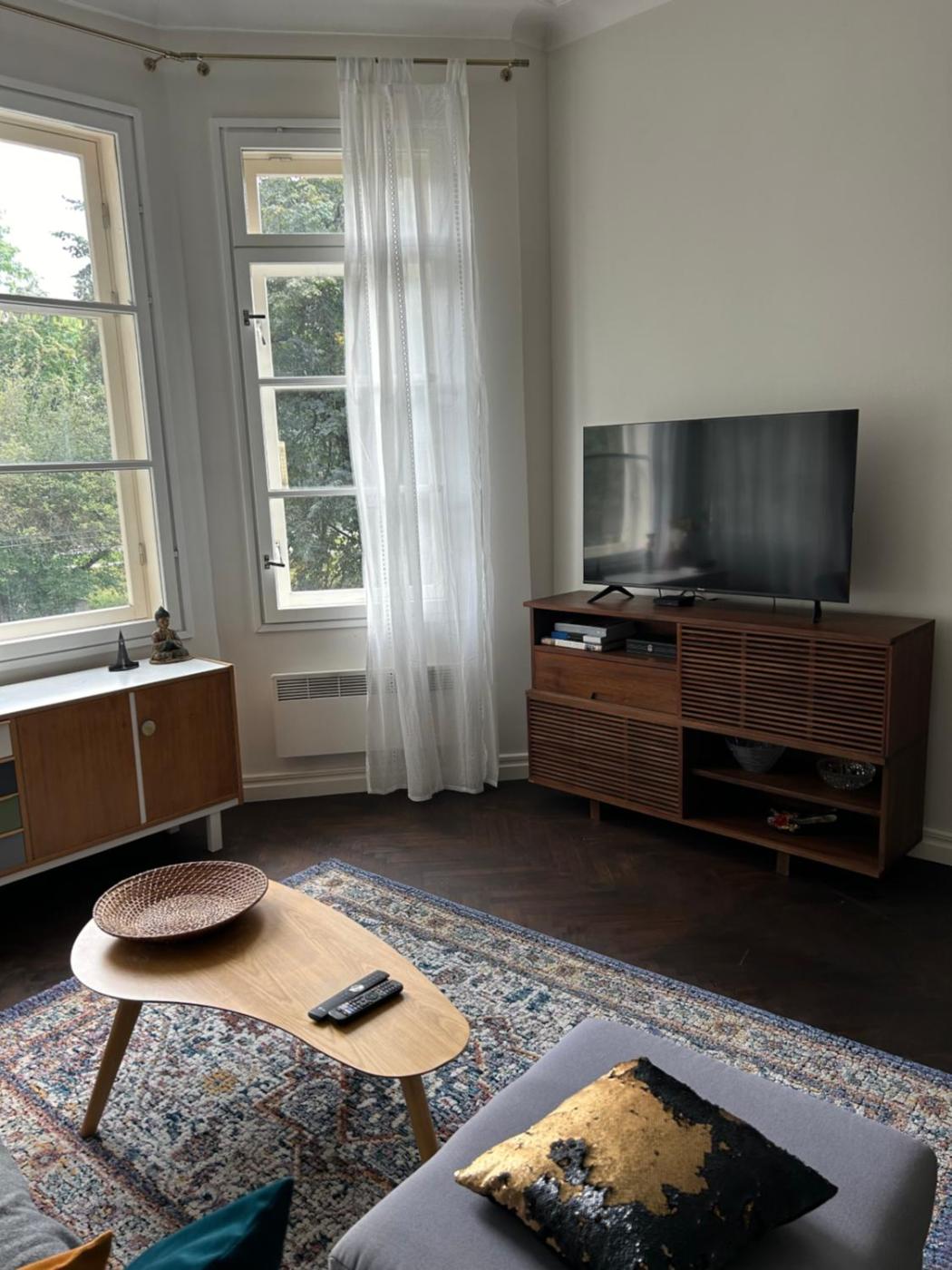 One-Bedroom Apartment. This apartments standout feature is the fireplace. This spacious apartment is comprised of 1 living room, 1 separate bedroom and 1 bathroom with a shower and a hairdryer. In the kitchen, guests will find a stovetop, a refrigerator, a dishwasher and kitchenware. The apartment offers a flat-screen TV with cable channels, a washing machine, a tea and coffee maker, a seating area as well as city views. The unit offers 1 bed.