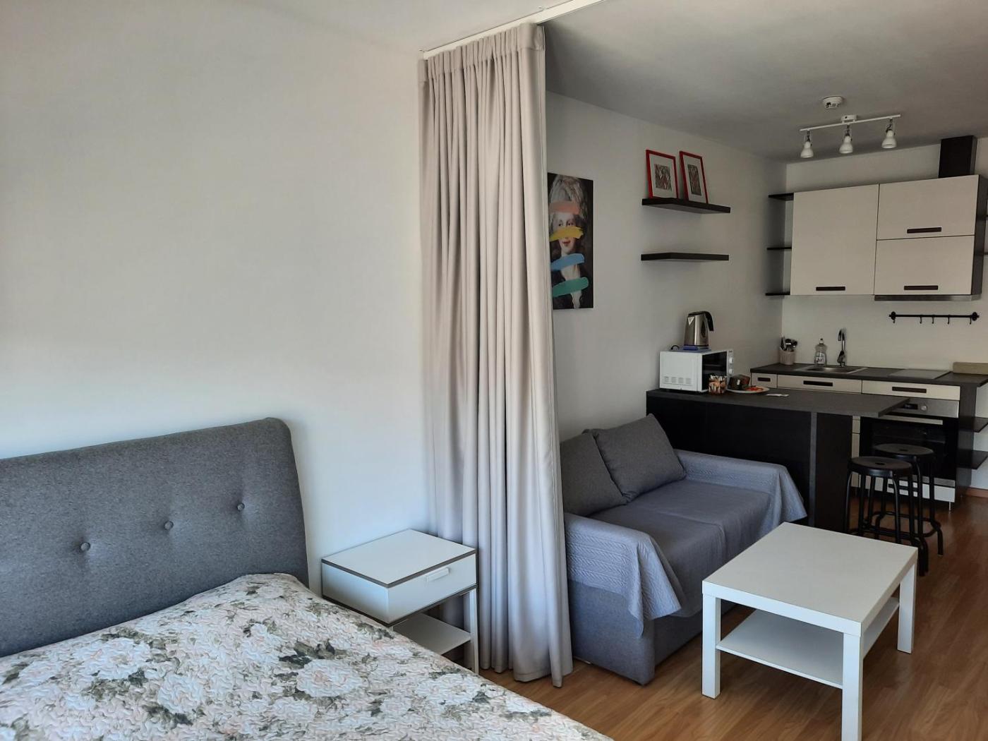 Studio Apartment. The apartment features 1 bedroom and 1 bathroom with a shower and free toiletries. Meals can be prepared in the kitchen, which is equipped with a stovetop, a refrigerator and a microwave. The apartment provides a washing machine, a tea and coffee maker, a wardrobe, a flat-screen TV with satellite channels, as well as city views. The unit offers 2 beds. ;