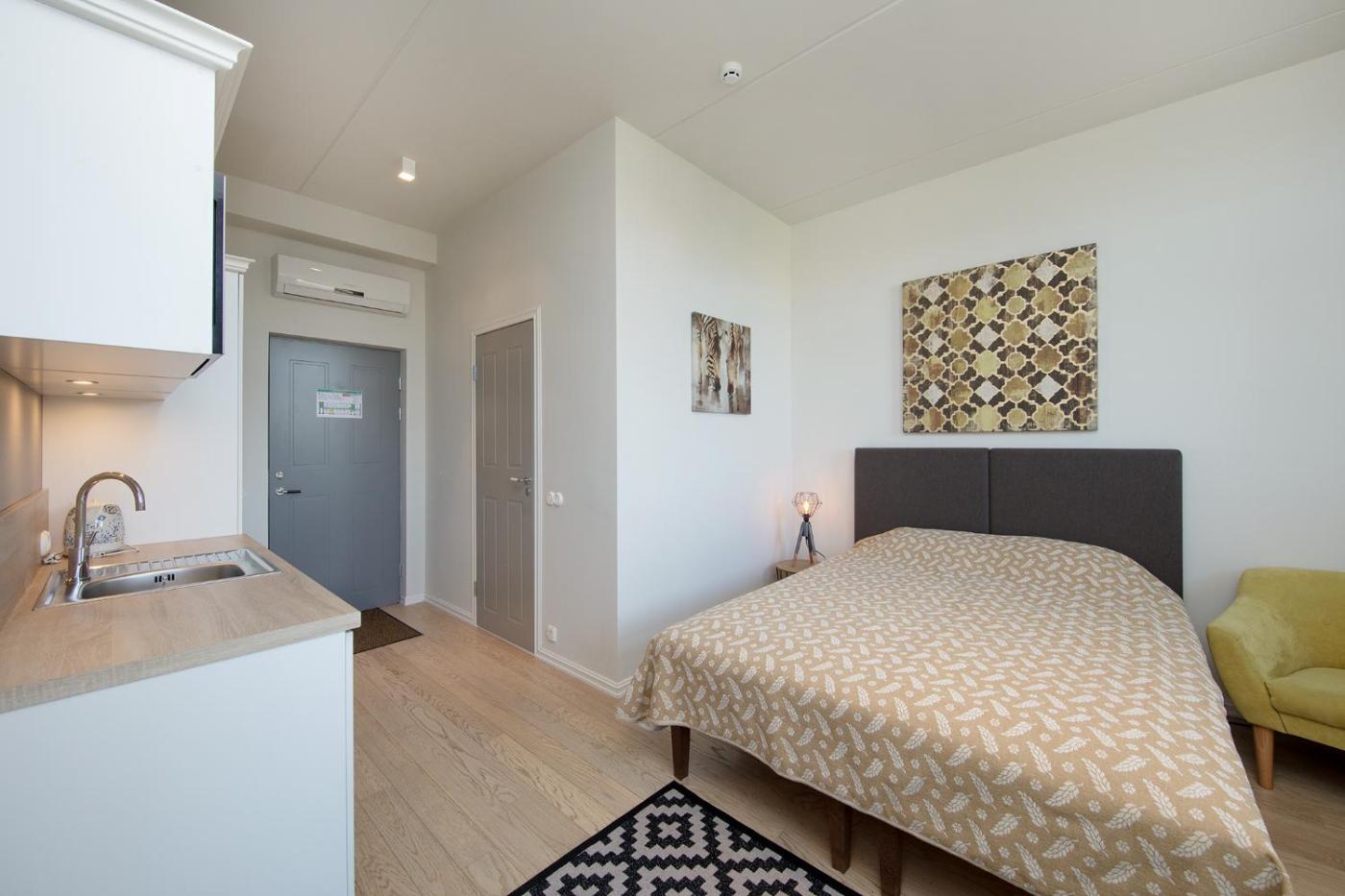 Studio Apartment. This air-conditioned apartment comes with 1 living room, 1 separate bedroom and 1 bathroom with a shower. Guests can make meals in the kitchen that features a stovetop, a refrigerator, kitchenware and a microwave. The apartment features soundproof walls, a tea and coffee maker, parquet floors, a flat-screen TV with cable channels, as well as city views. The unit has 1 bed. ;
