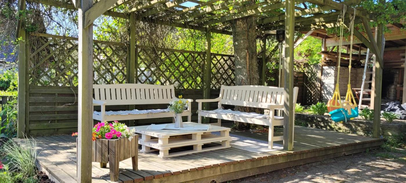 The apartment with a terrace and garden views features 1 bedroom, a living room, a flat-screen TV, an equipped kitchenette with a fridge and a stovetop, and 1 bathroom with a shower. Towels and bed linen are provided in the apartment. The property has an outdoor dining area.