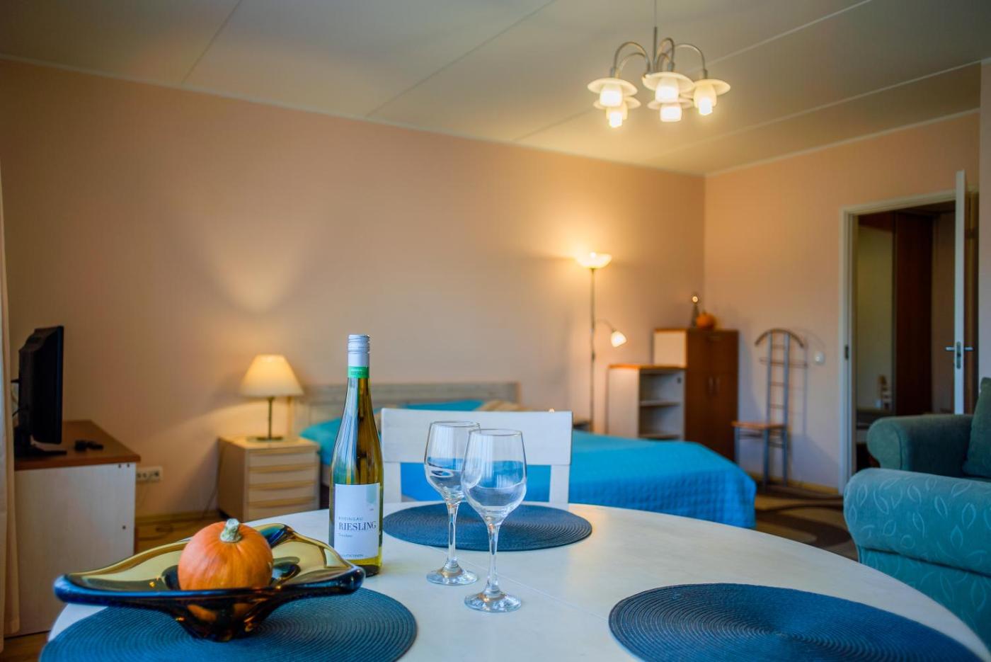 Studio Apartment. A modernly furnished studio apartment decorated in pastel colours. It features a comfortable sofa, a TV with satellite channels, a dining area and a washing machine. There is a kitchenette with a refrigerator and a microwave. The unit is located on the 4th floor in a building with no elevator. It has a view of the Old Town.