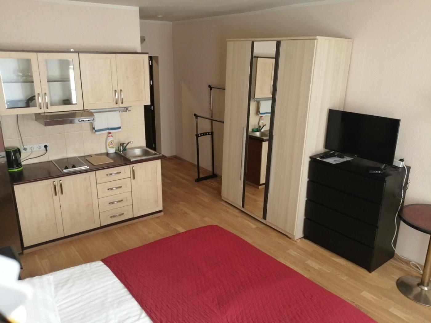 One-Bedroom Apartment. The apartment features 1 bedroom, 1 bathroom with a shower and a kitchenette. Meals can be prepared in the well-fitted kitchenette, which is equipped with a stovetop, a refrigerator, kitchenware and an oven. The apartment provides a washing machine, a wardrobe, an electric kettle, parquet floors and a flat-screen TV. The unit offers 1 bed. ;