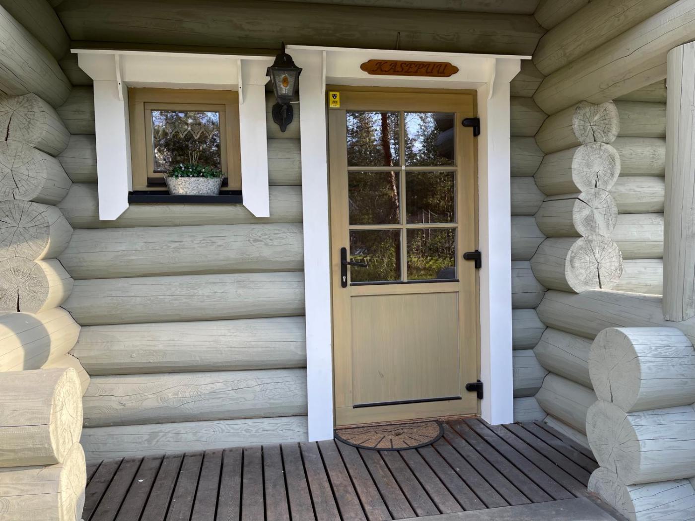 Holiday Home with Sauna. A two-storey house with two bedrooms and an open plan living room with a fireplace.